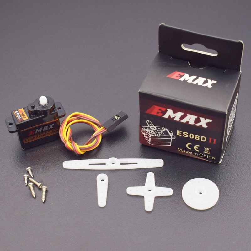 Emax ES08D II 8.5g Digital Servo Plastic Gear Digital Micro Servo is lightweight and ideal for RC aeroplanes. With plenty of torque and ample speed, the ES08D is the perfect budget everyday servo. Supplied with mounting hardware and additional servo output arms.