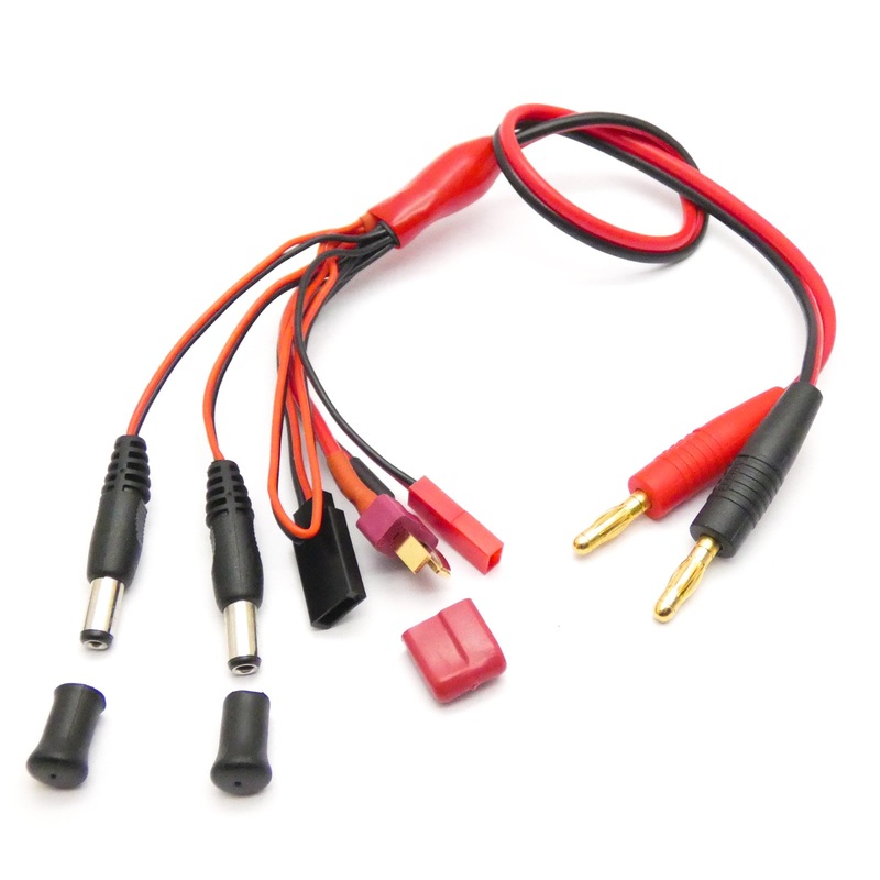 To suit most chargers, including iMAX, Bantam etc. Includes output plugs for T-Connecter, 2.5mm DC,2.1mm DC, JST and Futaba servo style, aswell as a blank pair of wires that you can connect your own plug to ifnecessary.